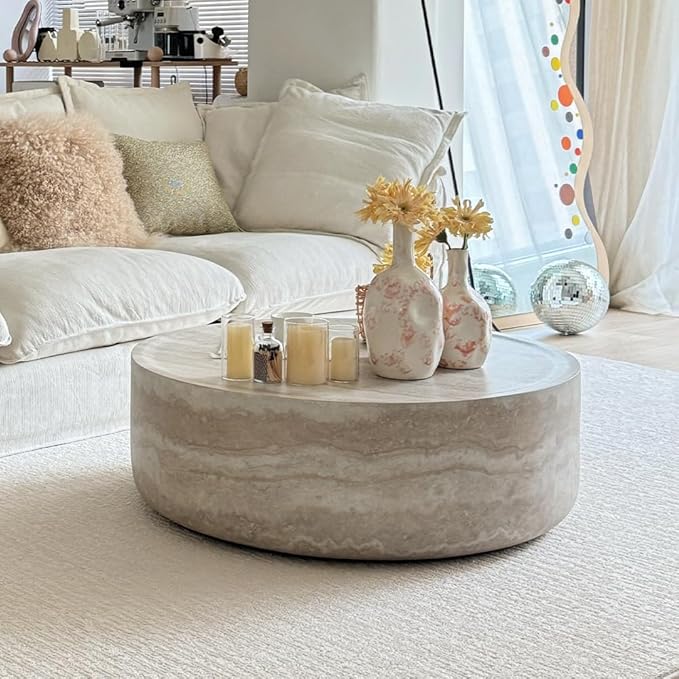 • ☕【Sturdy and Durable】This round drum coffee table is made of sturdy and durable fiberglass material, making the coffee table less likely to be damaged during use. Designed with no legs, a low coffee table that sits on the floor is very stable and supportive.