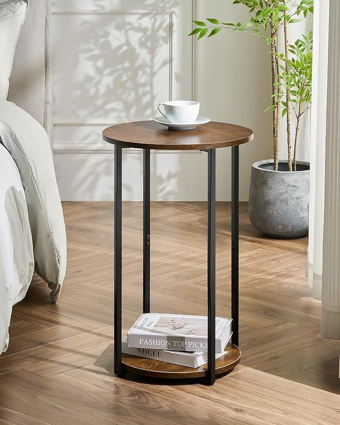 Round Side Table, Small End Table with Storage Shelf, Accent Table for Living Room, Bedroom and Small Spaces, Metal Frame, Rustic Brown & Black, 15.75" Dia x 25.4" H