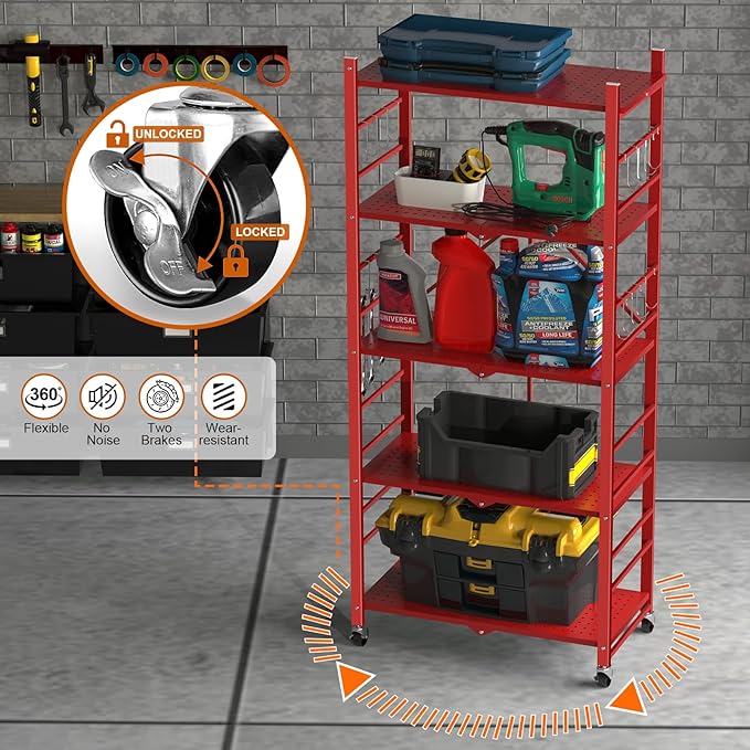 Storage Shelves with 20 Hooks, 5-Tier Foldable Shelves for Storage, Folding Utility Shelf Unit Pantry Shelf with Wheels, Metal Shelving Unit Rack for Garage Christmas Room, Red - No Assembly