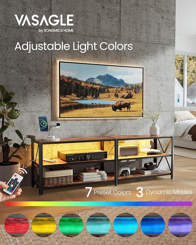 VASAGLE TV Stand with Power Outlets and LED Lights, for TVs up to 65 Inches, Entertainment Center with Open Storage Shelves, TV Console Table for Living Room, Rustic Brown and Ink Black ULTV118K01