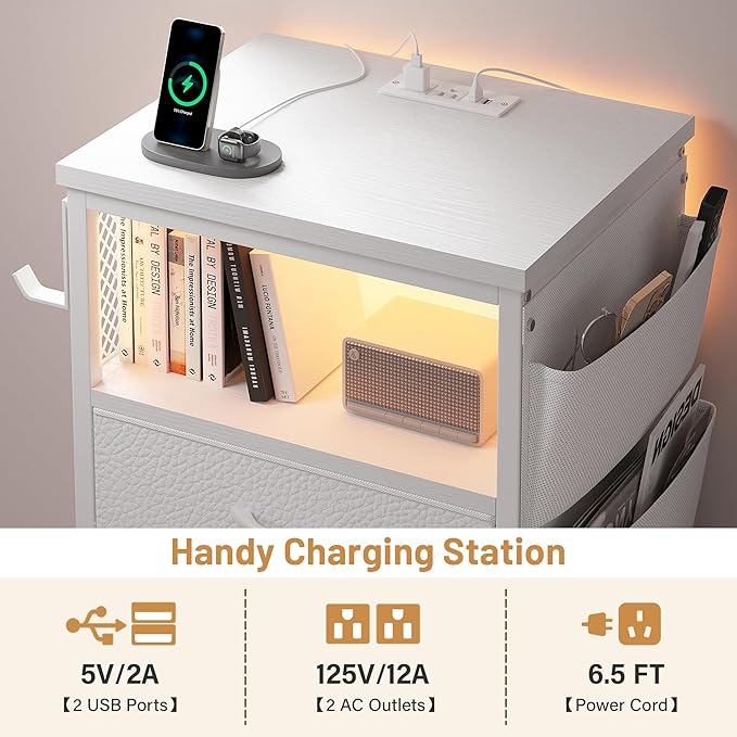 EnHomee Tall Night Stand with 5 Drawers, LED Nightstand with Ports & Outlets, White Dresser with Extra Side Bag & Storage Shelf & Hooks, Bedroom, Dorm, Closet