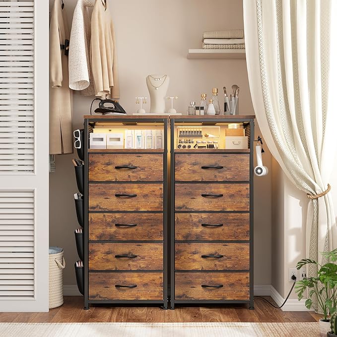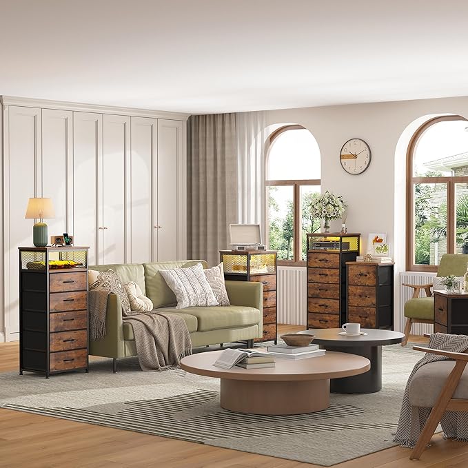 EnHomee Tall Night Stand Set 2 with 5 Drawers, LED Nightstand with Ports & Outlets, Bedside Table with Extra Side Bag & Storage Shelf & Hooks, Bedroom, Dorm, Closet