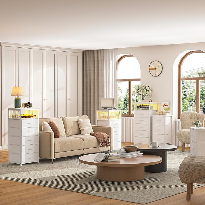 EnHomee Tall Night Stand Set 2 with 5 Drawers, LED Nightstand with Ports & Outlets, White Dresser with Extra Side Bag & Storage Shelf & Hooks, Bedroom, Dorm, Closet