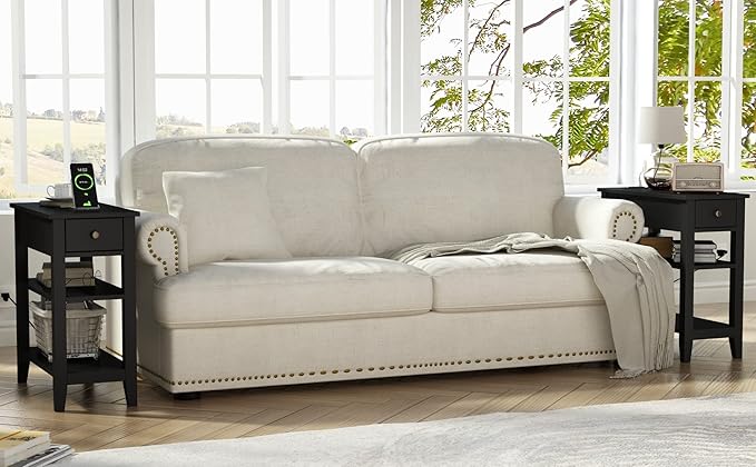 • 【Hidden and open storage】Skinny end table is space-saving and highly efficient in use,3-Tier(including desktop)open shelves of storage end table can hold your phone , remote controls , coffee , books, tissue box, photo frames, decorations, the drawer can help store remote control, cell phone charger wires and small snacks will keep tidy , wherever you set it on living room,bedroom home or office,it will accompany you to spend a pleasant time