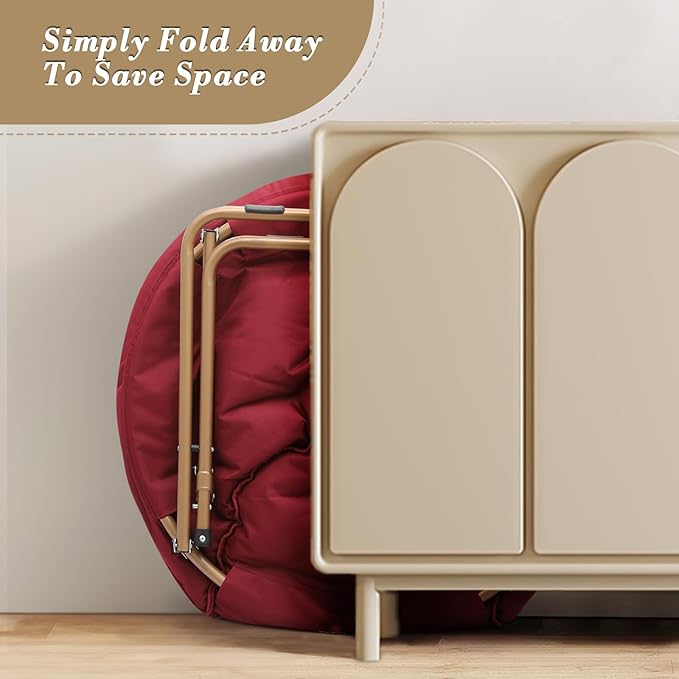 Athena Collection Saucer Chair with Ottoman Comfy Chair for Bed Room Living Room Folding Round Cozy Chair Faux Fur Metal Frame Foldable Lazy Chair Accent Chair Reading Chair, Red, Burgundy