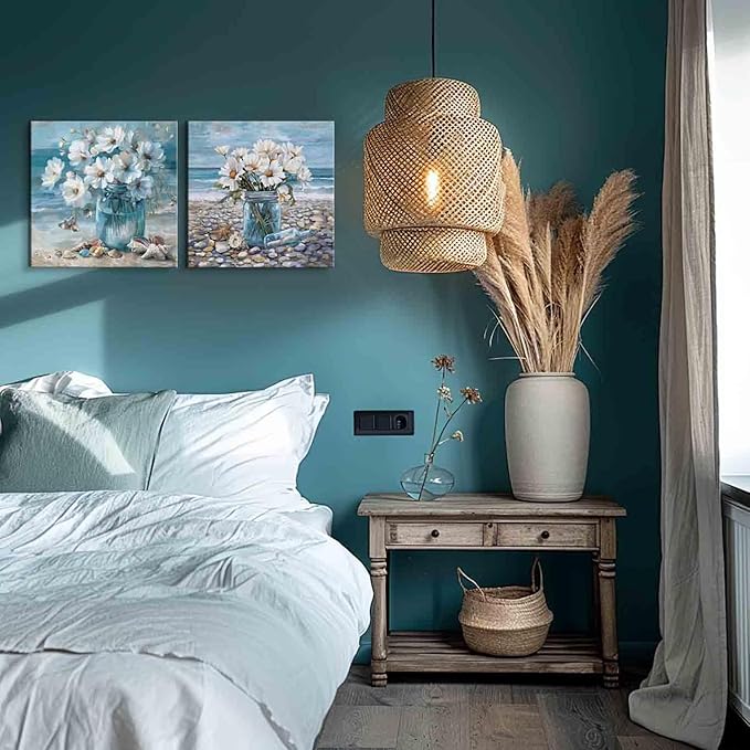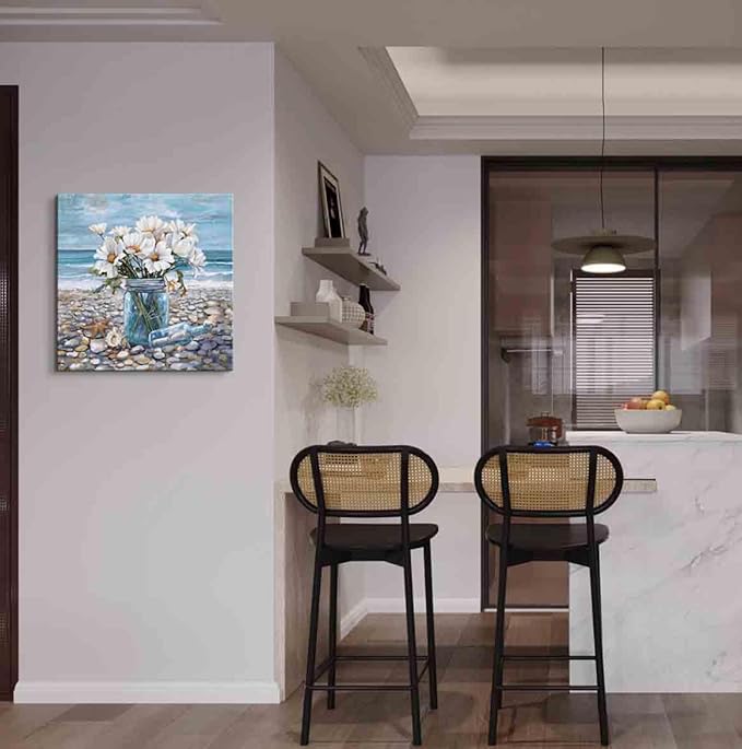 YUEYARIT Bathroom Wall Decor Beach Wall Art Ocean Theme Blue Picture Canvas Print Modern Coastal Artwork Framed Hanging Dining Office Living Room