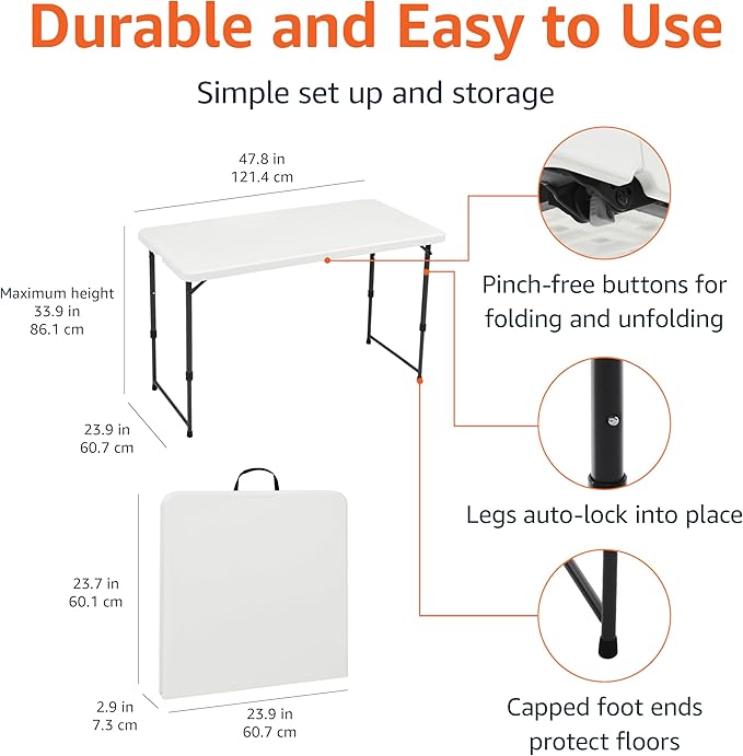 Amazon Basics 4 Foot Rectangular Folding Dining Table, 4 Adjustable Height Settings with Carrying Handle, Indoor & Outdoor, White, 47.8 x 23.9 x 33.9 in
