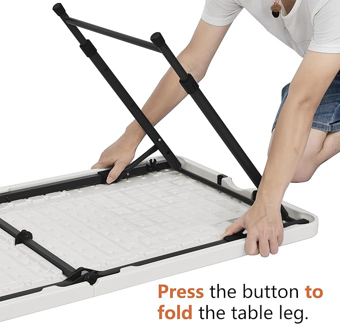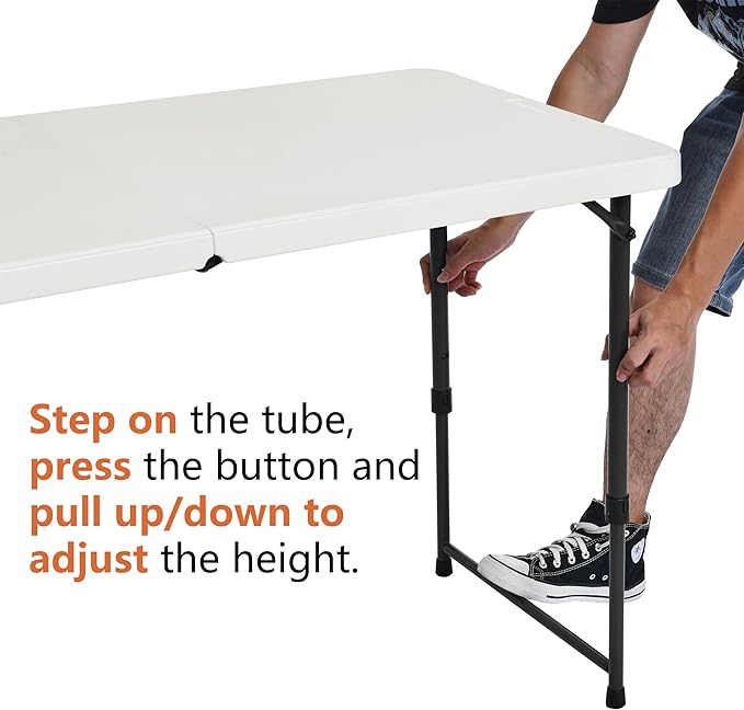 • CONVENIENT PORTABILITY: 4-foot folding table features an ergonomic carrying handle and innovative fold-in-half design for effortless transportation. Perfect for quick setup and compact storage in any space.
