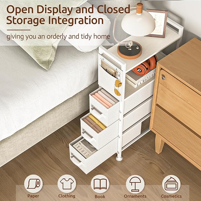 • [3 Deep Drawers:Dust-Free,Hassle-Free] Say goodbye to clutter and dust! Oppro 3 deep fabric drawers of Narrow night stand tall provide gap-free storage to keep your belongings clean and secure. Designed for toughness and dirt-resistant. perfect for storing clothes, miscellaneous, or office supplies—your space stays tidy with zero effort.