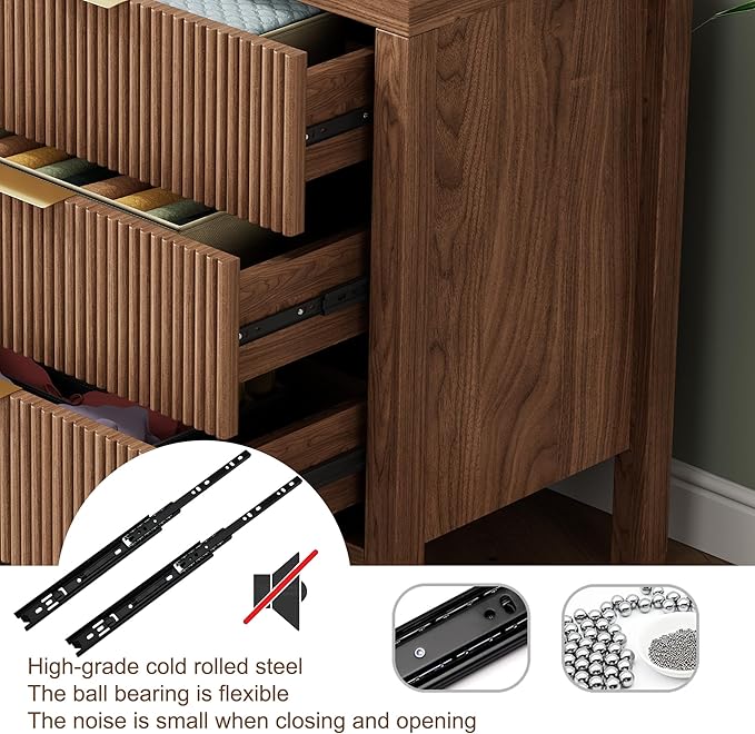 Fluted Nightstands Set of 2, Wooden Farmhouse Night Stands with 6 Drawer Bedside Table - Boho Tall End Table Accent Table for Bedroom, Living Room, Walnut