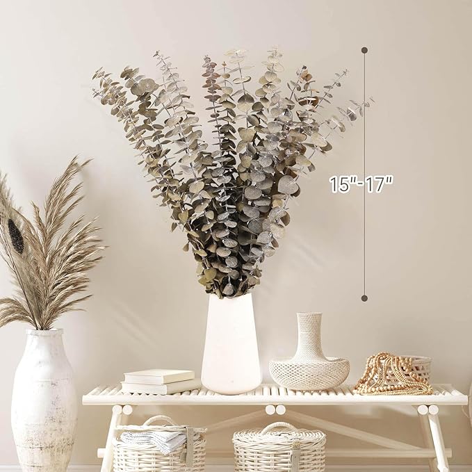 • Real Eucalyptus Plant: Each pack you receive is 16 pieces preserved greenery eucalyptus stems and 15-17 inches in length. Your fresh eucalyptus is made from natural live eucalyptus plant using special preservation techniques. Compared to artificial fake eucalyptus, it has the look and feel of real eucalyptus