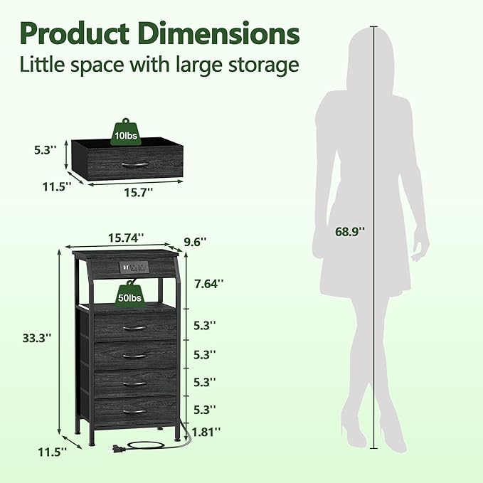 Furnulem Night Stand with Charging Station, 4 Drawer Dresser with Storage Shelf, 33.3 Inch Tall Side Table, Fabric End Table for Closet, Entryway, Bedside Furniture, 3 Ways to Use, Black Oak