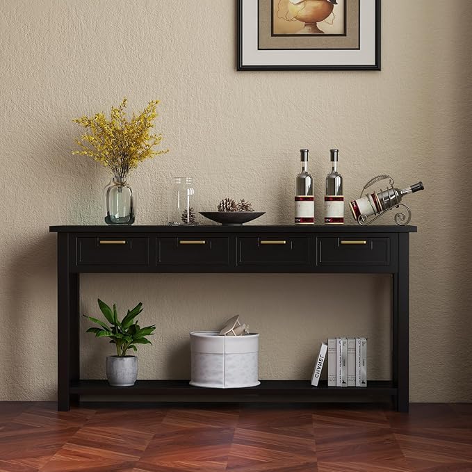 Console Table for Entryway with 4 Drawers, 60 Inch Long Foyer Table w/Open Storage Shelves and Handmade Metal Handle, Narrow Sofa Table for Living Room, Hallway, Black