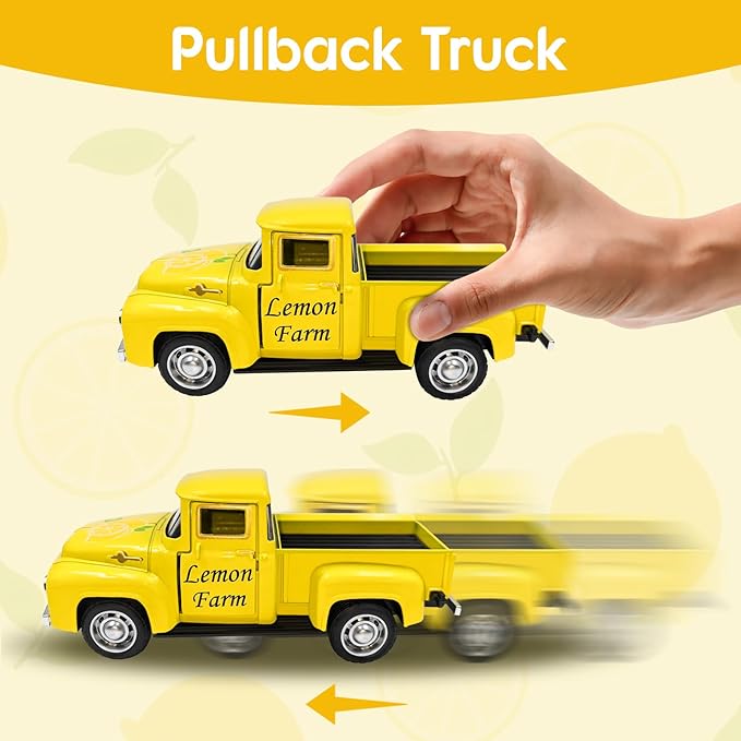 • VINTAGE TRUCK DECOR SIZE: Lemon party decorations are 5" x 2.2" x 2", removable mini faux lemons are 1" x 0.8", Our mini lemon diecast truck is the perfect size for cake topper decorating, placing on tiered trays and shelves. This is a wonderful farmhouse home kitchen accessory and decoration for your table or any corner that needs decorating (Please make sure the size meets your requirements before purchase!)