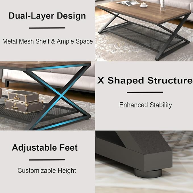 • Enduring Design with an Artisanal Touch: The wooden allure of this rustic center table is not just skin-deep; its thick engineered wood build, mimicking the textured grains of oak, stands on a sturdy metal base. The X-shaped sides not only provide stability but also contribute to the living room table's industrial aesthetic, making it an effortless addition to both farmhouse and modern minimalist interiors.