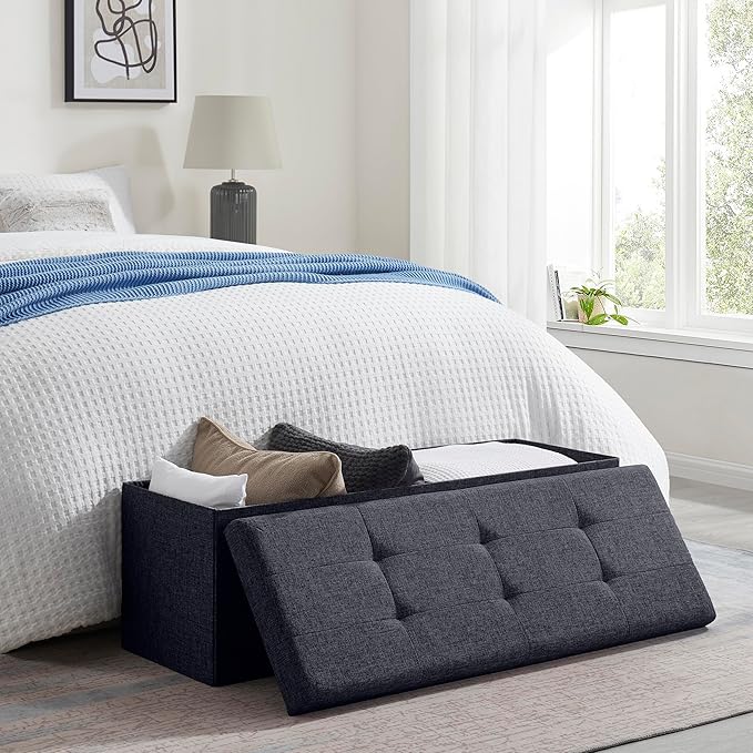 • FOLDABLE: It’s lightweight folding design allows you to store this ottoman away when not in use. The comfortable padded lid come off allowing you to fold the ottoman flat and store in any space.
