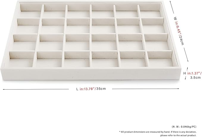 • Size: 13.78" x 9.45" x 1.58" 35 x 24 x 3.5cm (L x W x H), Pack of 1, jewelry not include. The jewelry display trays are great for rings, earrings, coins and other jewelrys, create your own personalized jewelry storage system