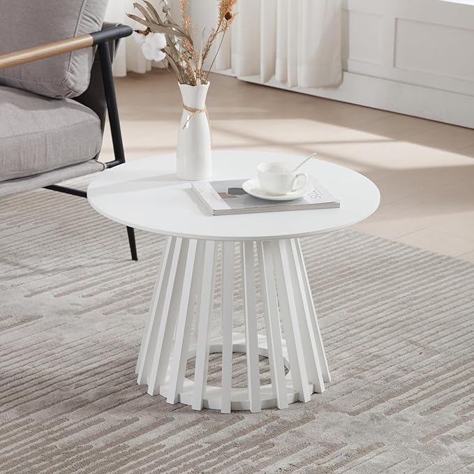 LukeAlon 24" Round Coffee Table, Mid Century Modern Wooden Center Table with Columnar Wood Strips Base Sofa Side Table Circle Tables for Living Room Small Space, White