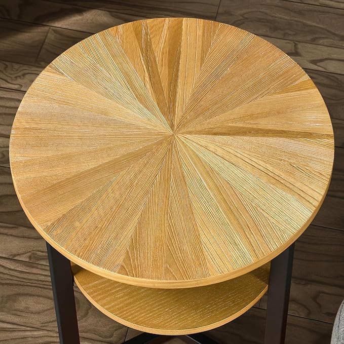 Round End Table with Storage Shelf, 19.29in Circel Accent Side Table with Black Metal Legs, 2-Tier Wood Round Sofa Side Table for Living Room Bedroom, Oak-BZ