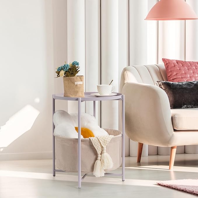 danpinera Round Side Table with Fabric Storage Basket, Metal Side Table Small Bedside Nightstand with Removable Tray Top for Living Room, Bedroom, Nursery, Laundry, Light Violet