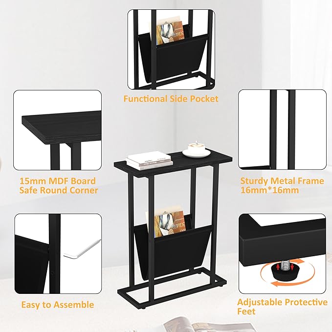 • Small Narrow End Table: This different side table was made of MDF board + black matte paint metal feet + cloth bag + adjustable foot pad, and it is perfect for small or narrow space.