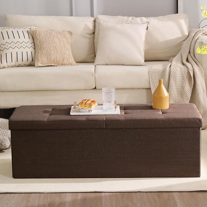CUYOCA 45.3 Inches Storage Ottoman Bench Foldable Seat Footrest Shoe Bench End of Bed Storage with Flipping Lid, 166L Storage Space, Linen Fabric Brown