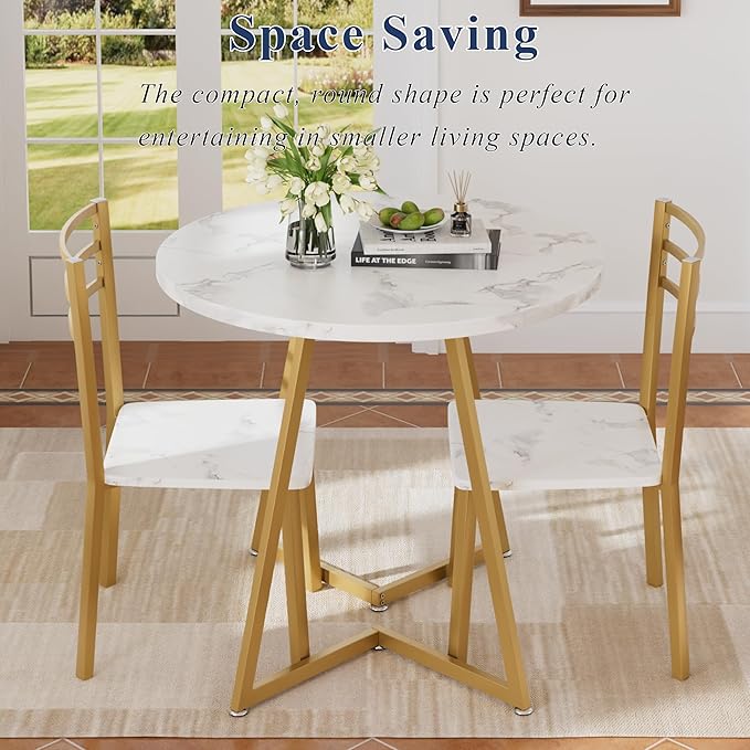 • Elegant Dining Table Set - Some of our best memories are created at our dining tables. This 3 piece dining room table set with a marbling tabletop and gold frame, will blend perfectly into your living room and kitchen, bringing simplicity and elegance.