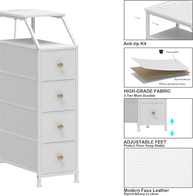 Tohomeor Narrow Dresser Tall Skinny Storage Tower Vertical Slim Chest of Drawers with Charging Station Small Nightstand Side Table for Bedroom, Bathroom, Small Spaces (White, 4 Drawers)