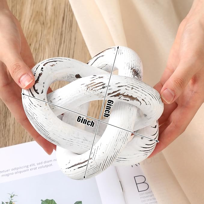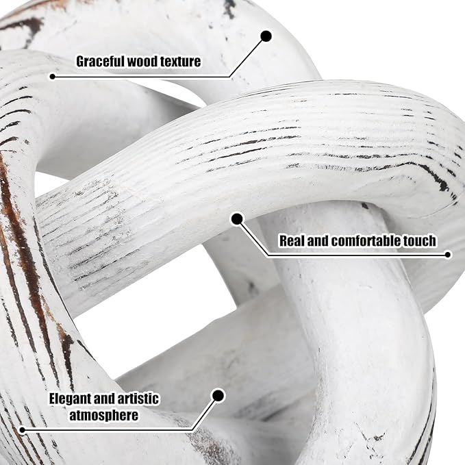 3 Link Wood Knot Decor - Hand Carved Coffee Table Decoration, Boho Chain Link Decor, Modern Shelf, Rustic Objects for Home Living Room Bedroom(Retro White)