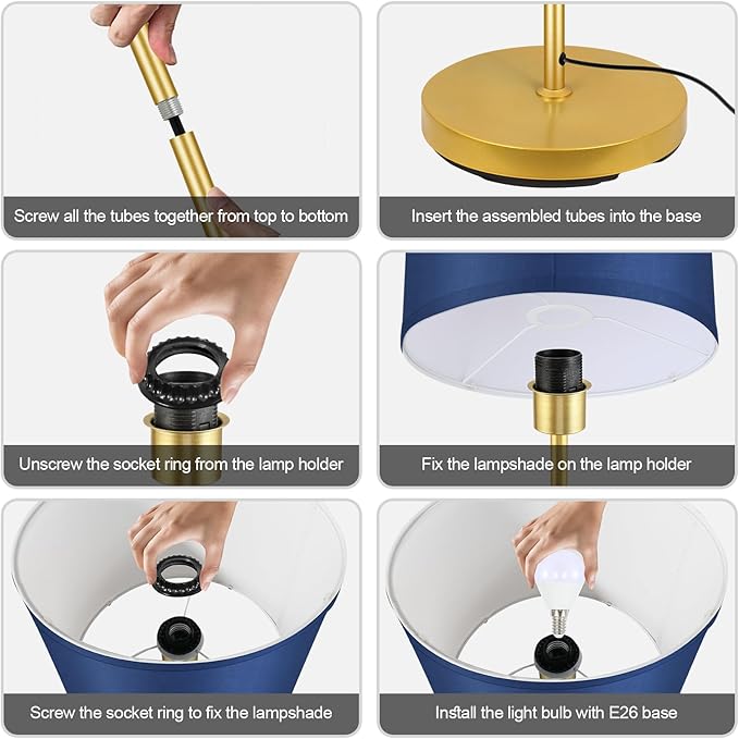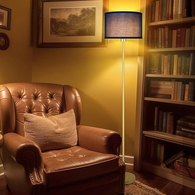 • 【Easy Assembly & Premium Quality】Made with gold metal body and blue linen lampshade, the led floor lamp is simply designed and look good in any surroundings; With the 6lb sturdy base, this 58-inch (5ft) tall lamp stands steadily and won't tip over easily, which is safe for kids; Without tools required, you just need to screw all the parts together to finish the assembly of this standing lamp; PS. The assembly video is attached to the product page