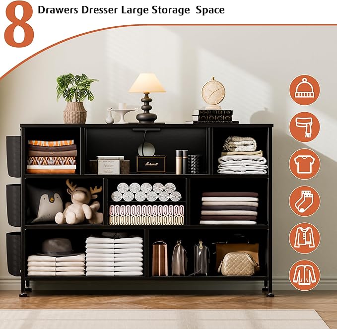 • Multifunctional Design: YaFiti 8 drawer dresser is designed with power outlets and LED lights equipped with 15 color flashing modes to create the perfect lighting atmosphere for any scene. At the same time, it is convenient for you to charge your cell phone, desk lamp, gaming device, tablet and other devices.