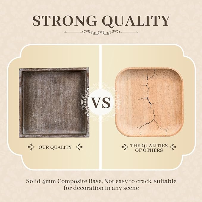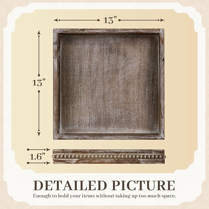 • [Carefully Designed]: He's not an oversized tray just larger than the regular siz, Each farmhouse decorative tray is handmade by skilled craftsmen. Designed to be 1” larger than the usual regular sized trays of 13" x 13" x 1.6" wooden tray is not only more practical but also beautiful to decorate, adding a unique and elegant touch to your home.