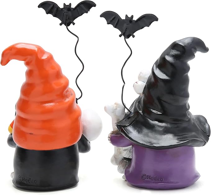 • Exquisite Detail Design: The left elf grips a meticulously carved skull in her right hand, wearing a striking orange hat with a tiny spider crawling on it, sending shivers down your spine. The right elf holds a bone in her left hand, seemingly casting a mysterious spell. She stands on a Halloween pumpkin, wearing a black witch hat with a pair of bloodshot eyes on it, drawing your gaze.