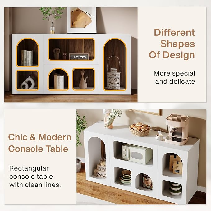 • Large Storage Space: This modern console table with 6 compartments offers abundant storage space. It's an ideal spot for displaying items like books, collectibles, magazines, vases, plants or storage boxes. The 6 storage compartments are excellent for neatly organizing your belongings.