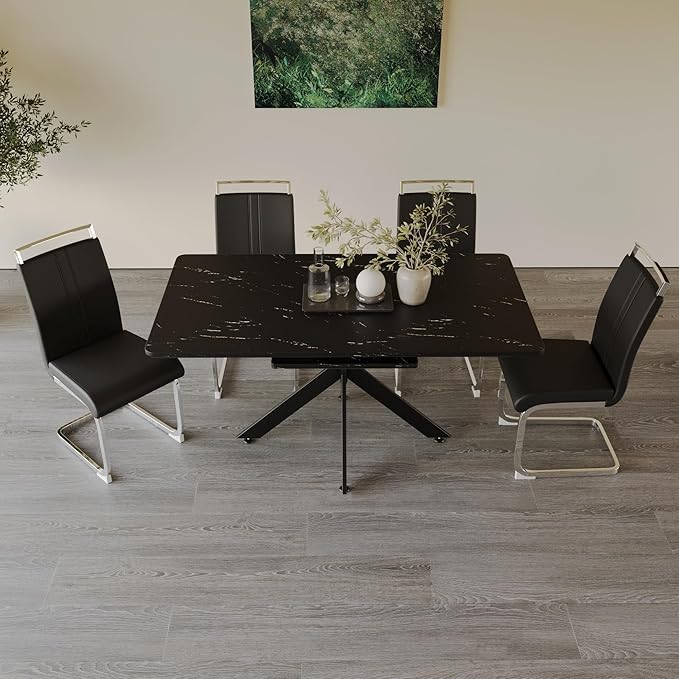 Marble Dining Table for 4-8, 62.4''-78.15'' Extendable Dining Table, Modern Kitchen Table, Space Saving Rectangular Table for Office and Dining Room(Black)