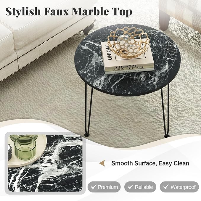 Giantex Round Coffee Table, Faux Marble Center Table with Metal Legs, Sofa Accent Side Table, Modren Coffee Tables for Living Room, Bedroom, Balcony, Small Space (Black)