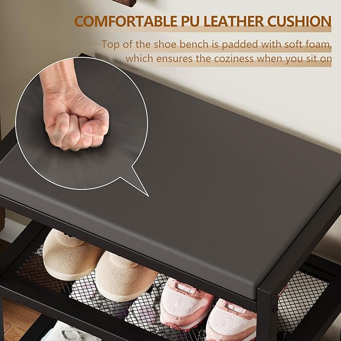 • Effortless Clean, Easy Assembly: Our upholstered Shoe Bench features an easy-to-clean synthetic leather surface, ensuring simple maintenance. Additionally, it comes with clear and straightforward instructions, along with an assembly tool, making setup a breeze. Spend less time on maintenance and assembly, and more time enjoying the convenience of our shoe rack bench.