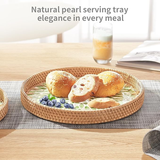• 【Eco-friendly & Premium Material】: Airesly serving tray made from 100% natural high-quality rattan, woven with mother of pearl inlays at the bottom, ensuring durability, environmental friendliness, and a healthy choice for your home.