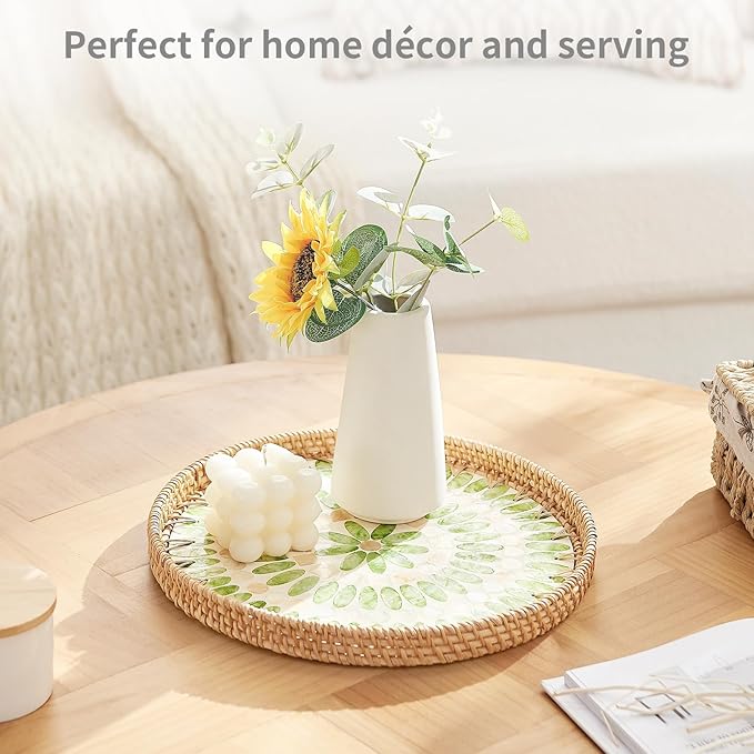 • 【Eco-friendly & Premium Material】: Airesly serving tray made from 100% natural high-quality rattan, woven with mother of pearl inlays at the bottom, ensuring durability, environmental friendliness, and a healthy choice for your home.