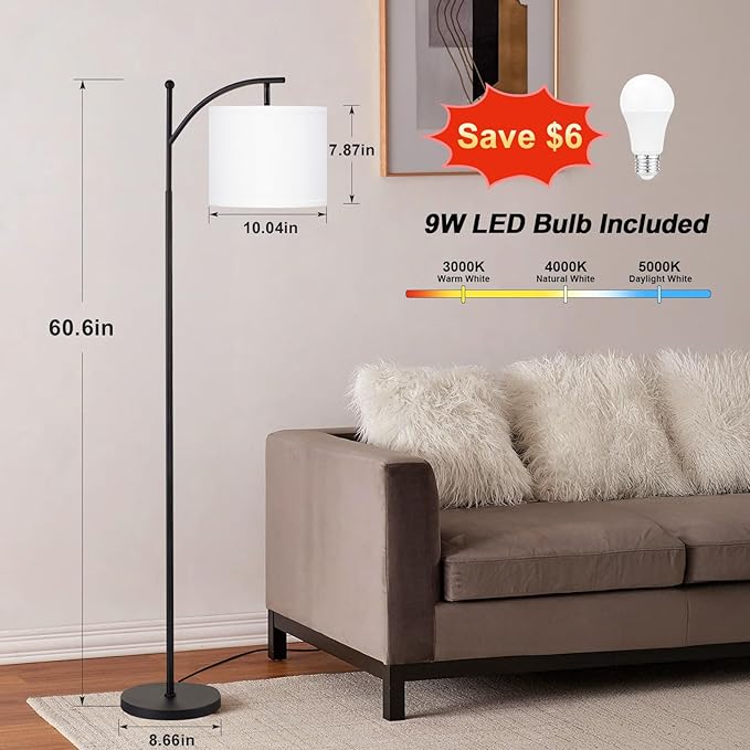 • 3 Color Temperature Bulb Included: Dimension of this floor lamp is 60” height, diameter and height of lampshade is 10.04” and 7.87”, diameter of base is 8.66”. Includes a 9W LED bulb which has 3 different color adjustable temperature setting: 3000K/5000K/4000K. You can easily change the color temperature to set the overall ambiance of the room.