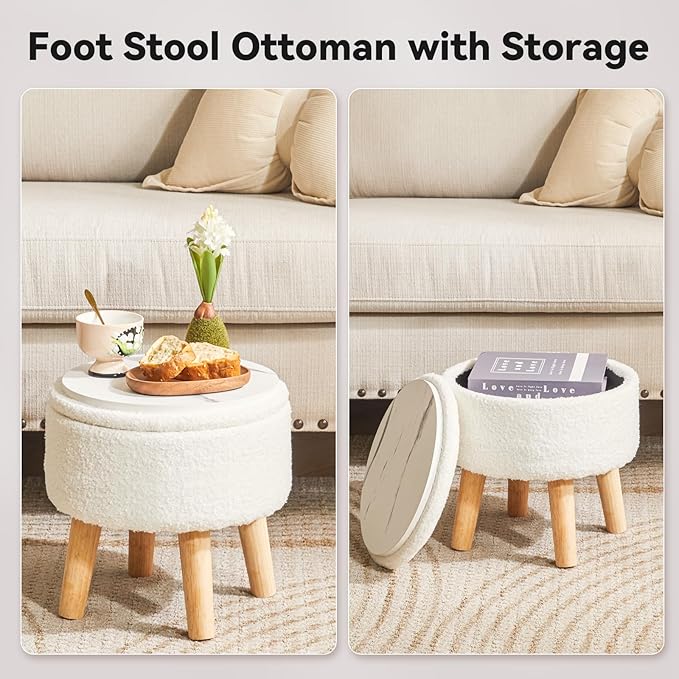 IBUYKE 13 Inch Foot Stool Ottoman with Storage, Round Small Foot Rest with Padded Seat and Wood Legs, Teddy Velvet Mini Footstool for Living Room Couch Bedroom Entryway, Cream WBD006W