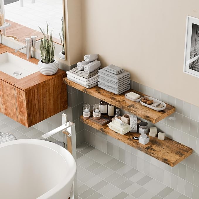 • Easy to install: You will receive 2 pieces of wooden shelves, 2 metal support rods, as well as an instruction manual and the screws you need to install. You only need to fix the metal support rod to the wall first and then connect the wooden shelf to it. Finally, screw the shelves and support rods together