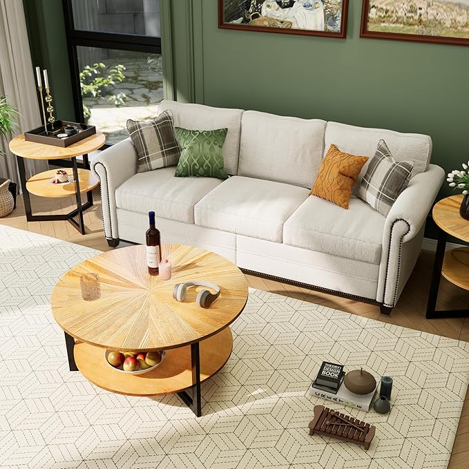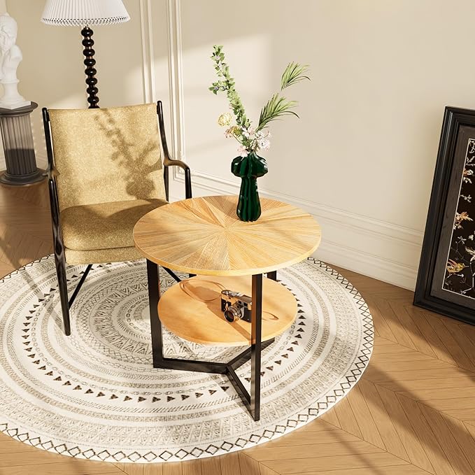 • Modern Minimalist Chic: This large round end table combines a circular, umbrella-patterned tabletop with a triangular iron frame structure, featuring a two-tone design of natural wood color and black. Its modern, minimalist aesthetic complements various home styles and sofa shapes, adding a relaxed ambiance to your living room.