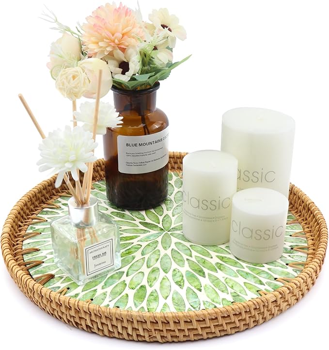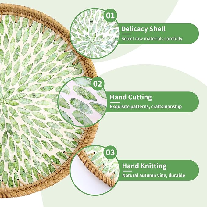 Round Rattan Tray with Mother of Pearl Inlay, Decorative Rattan Serving Tray for Home Boho Decor, Coffee Table, Bread, Food, Tea, Ottoman Trays-Fruit Wicker Basket, 100% Natural Materials Green- 13.8"