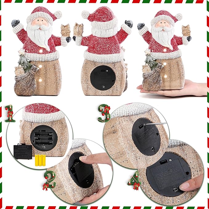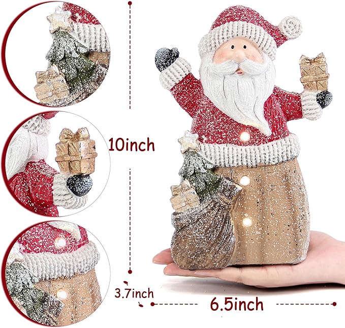 • Christmas Decorations: The figurine size is 6.5 x 3.7 x 10 inches, and weight is 1.1 LB. It is made of resin with glitter coating on the surface. Santa Claus is dressed in red, carrying a gift bag and sending presents to everyone. This Christmas decor combines charm, functionality and festival spirit to create a cozy and christmassy atmosphere in your home