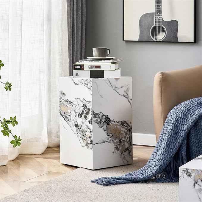 • MDF SOFA TABLE: The MDF frame provides essential stability and strength, ensuring a reliable surface for placing items without any wobbling. The use of MDF material, coupled with a faux marble finish process, not only contributes to its attractive appearance but also guarantees superior durability. The inclusion of foot pads prevents slips and protects your floor from scratches.The cube faux marble end table can hold up to 100 Lbs