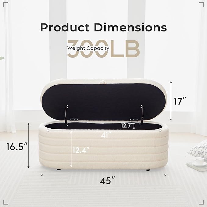 • Durable Construction: The bench with storage is covered in soft, plush boucle fabric, offering a comfortable seating experience for you and your family. Its cushioned design is filled with thick, high-resilience sponge that maintains its shape even with prolonged use. Constructed with a high-quality wooden frame, this storage ottoman beach supports up to 300 lbs, ensuring stability without any wobbling or shaking