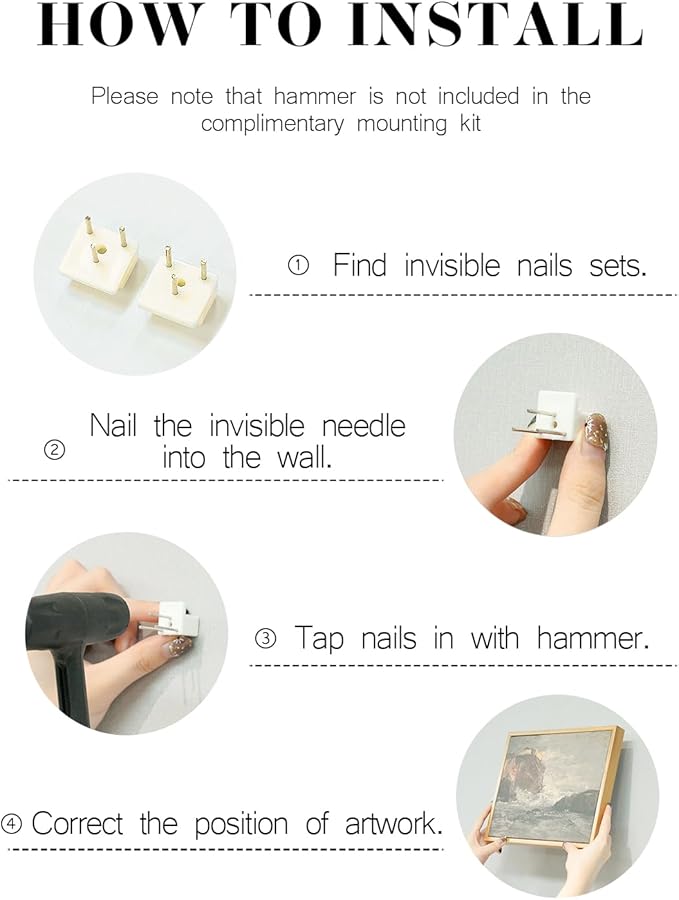 • Ready To Hang : This framed canvas art wall decor measures 12x16 inches, comes with 2 invisible nails which makes it easy to hang. Please read the installation instruction image before nailing the hook on your wall. (This item is handmade, so please allow the size error to be about 0.2 inches)