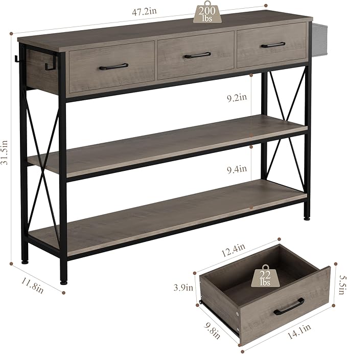 HITHOS 47.2" Long Console Table with 3 Drawers and 3-Tier Storage Shelves, Industrial Sofa Table for Living Room Entry Way