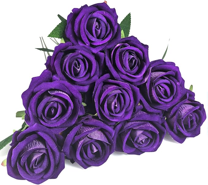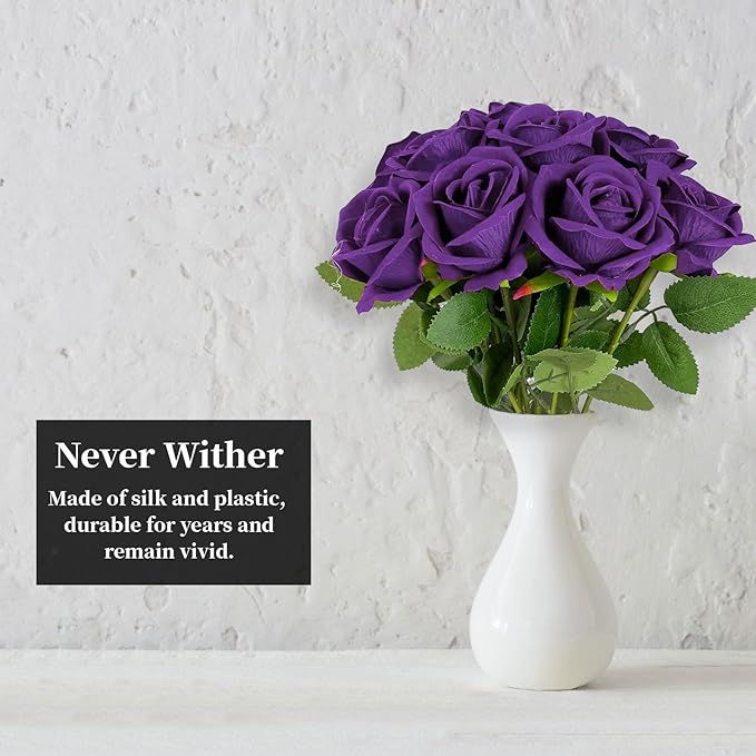 10 PCS Artificial Roses with Long Stems Silk Flowers Realistic Foam Flowers Fake Roses for Valentine's Day Home Wedding Halloween Decor(Dark Purple)